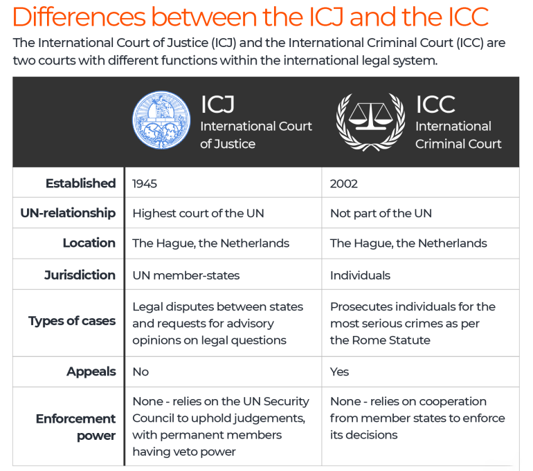 The International Court of Justice (ICJ) settles disputes between countries (States) and is an official organ of the UN. The International Criminal Court (ICC) prosecutes individuals for crimes like genocide and is an independent body established by the Rome Statute.