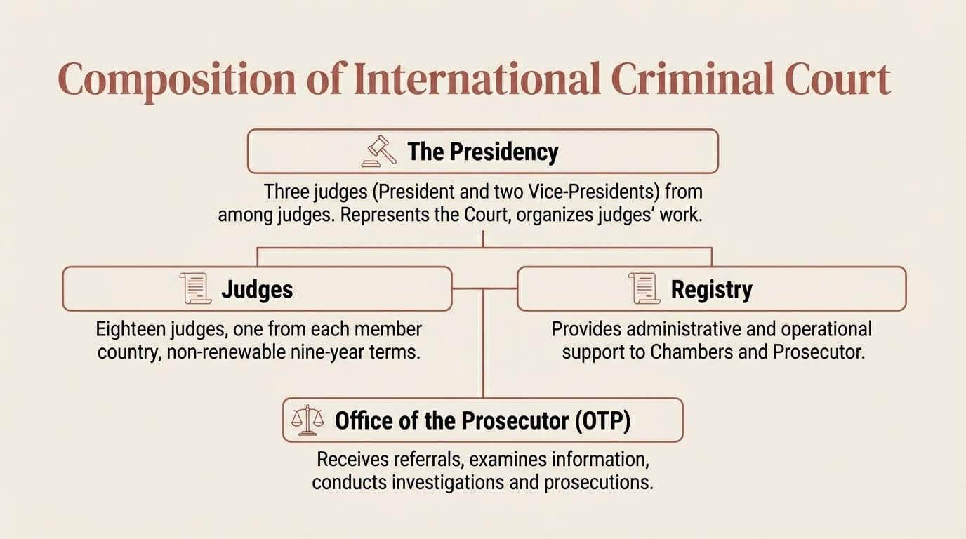 The International Criminal Court (ICC) is a permanent global court established by the Rome Statute in 2002. Based in The Hague, it prosecutes individuals for genocide, war crimes, crimes against humanity, and aggression when national courts fail to act. It aims to end impunity for serious international crimes.