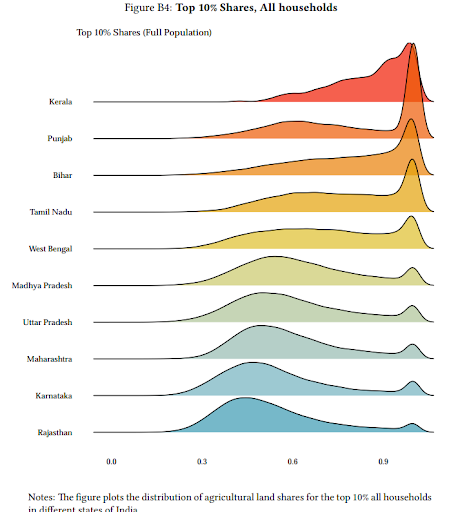 The study reveals that the top 10% of rural Indian households own 44% of total agricultural land, while 46% of rural households are completely landless. It also highlights extreme village-level inequality, with Kerala having a land Gini coefficient of 90.