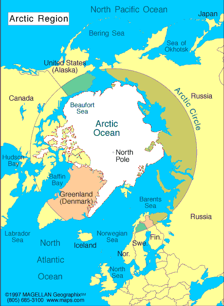 Note: The Arctic region covers parts of eight countries: Canada, Greenland, Iceland, Norway, Sweden, Finland, Russia, and the United States.