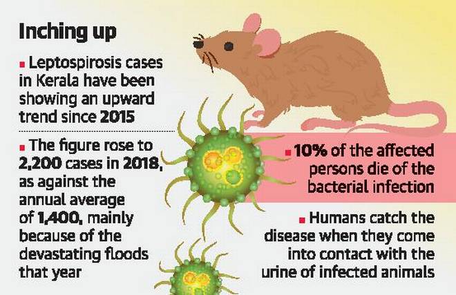 Context: More than 1,000 leptospirosis cases are reported from Kerala every year, with 10% of the affected persons dying of it. The cases are showing an upward trend since 2015.