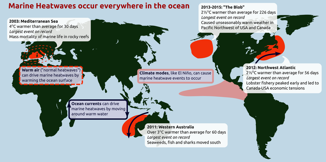 - Marine heat waves affect ecosystem structure, by supporting certain species and suppressing others.