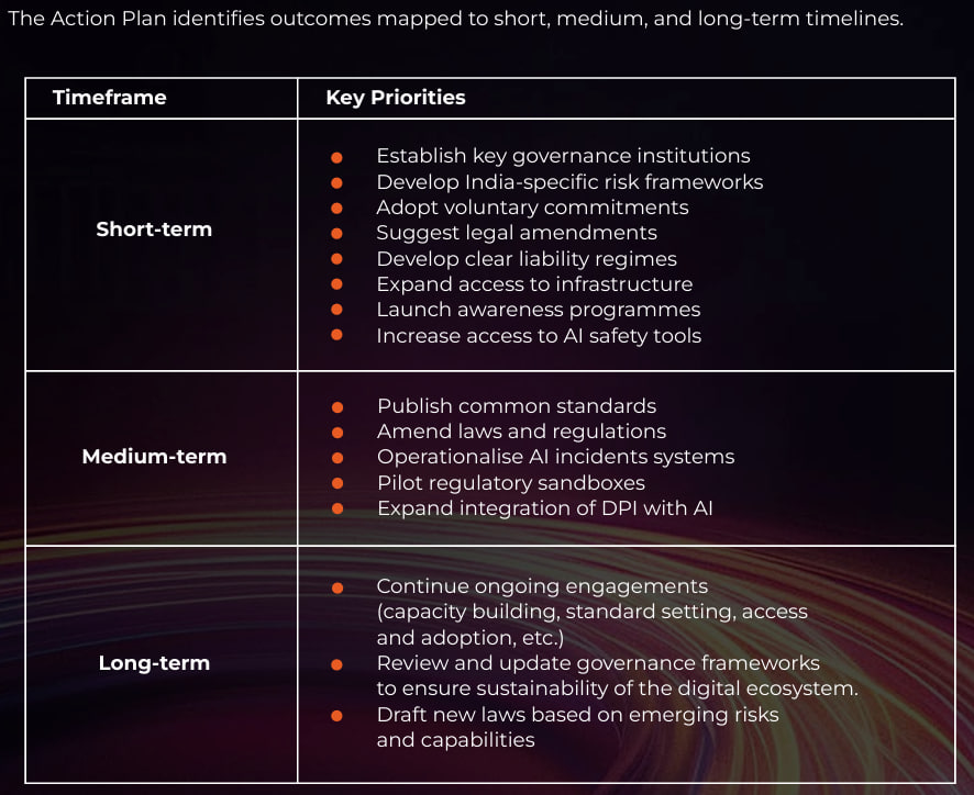 Long-term: Introduce new laws for emerging risks, ensure continuous oversight, and strengthen India’s global leadership in AI governance.