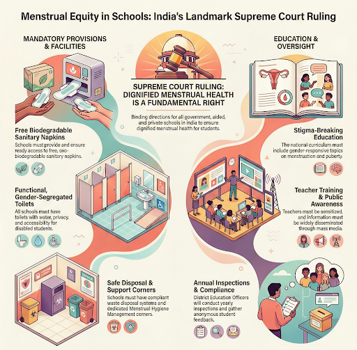The Supreme Court, in its judgment on January 30, 2026, declared that the right to menstrual health and access to Menstrual Hygiene Management (MHM) in schools is a fundamental right, integral to the right to life and dignity under Article 21 of the Constitution.