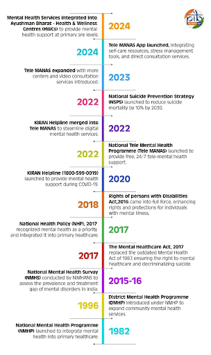 Government initiatives include the National Mental Health Programme (NMHP), the Mental Healthcare Act, 2017, the Tele MANAS national helpline, and the integration of mental health services into Ayushman Bharat.