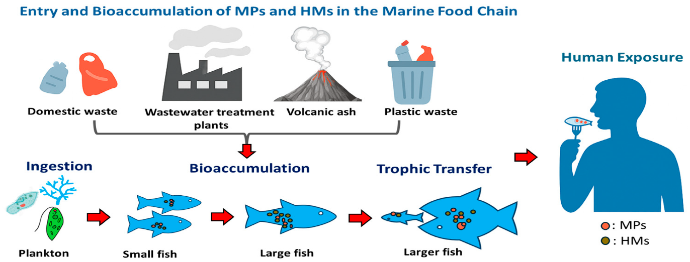 - Microplastics absorb toxic chemicals like Polycyclic Aromatic Hydrocarbons (PAHs) and heavy metals, which enter the food chain.