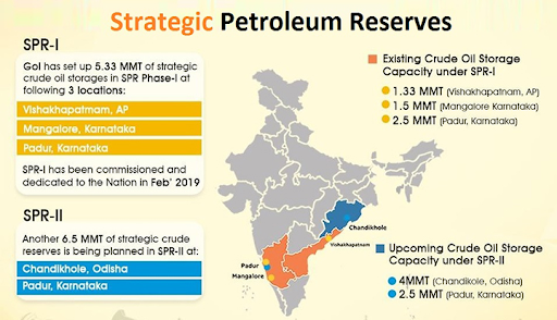 - Current Infrastructure (Phase I): Managed by Indian Strategic Petroleum Reserve Limited (ISPRL), these facilities have a total capacity of 5.33 Million Metric Tonnes (MMT) located at Vishakhapatnam (1.33 MMT), Mangaluru (1.5 MMT), and Padur (2.5 MMT).