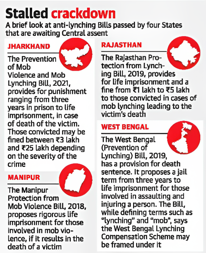 - Some states, such as Rajasthan, Manipur, West Bengal, and Madhya Pradesh, have enacted or proposed anti-lynching laws that define mob lynching as a specific offence and prescribe harsh penalties for it. These laws also provide for compensation and rehabilitation of the victims and their families, as well as accountability of the police and public officials for any negligence or failure in preventing or controlling mob lynching.