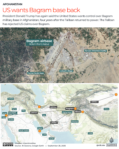 President Donald Trump demanded the return of the Bagram air base, citing its vital strategic location near China's nuclear facilities in western Xinjiang. He claimed the Biden administration gave up the "incredible strategic asset" unnecessarily and warned of "BAD THINGS" if Afghanistan refused to hand it back.