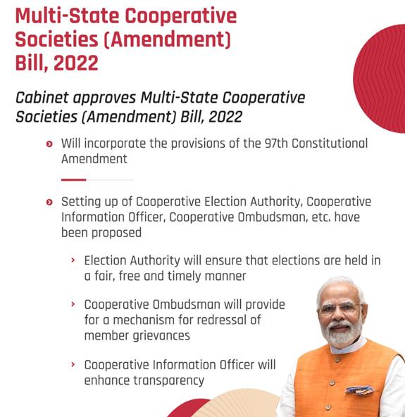 - The Union Cabinet approved the Multi-State Cooperative Societies (Amendment) Bill, 2022.