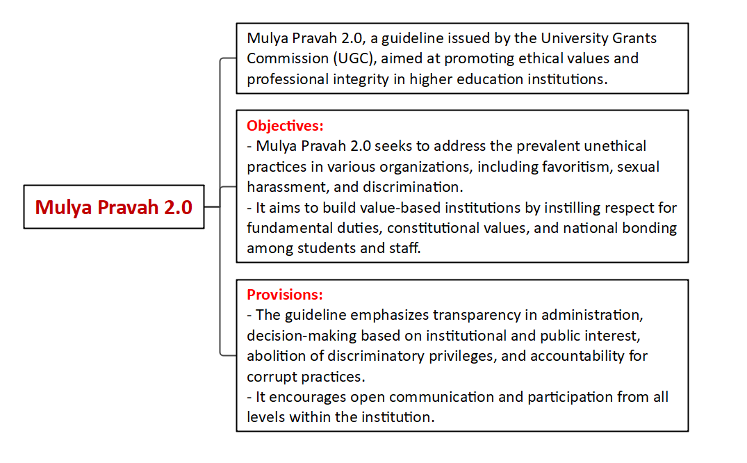 Context: The University Grants Commission (UGC) issued the new guideline, Mulya Pravah 2.0, in response to surveys revealing prevalent unethical practices like favouritism, sexual harassment, and gender discrimination in various organizations.