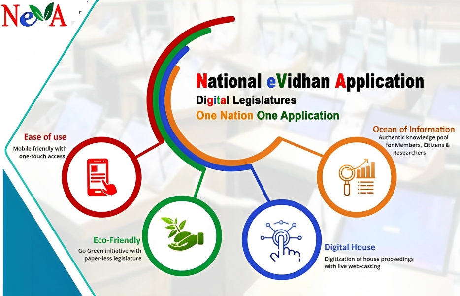 - The National e-Vidhan Application (NeVA) is a system for digitising the legislative bodies of all Indian states and the Parliament through a single platform on which house proceedings, starred/unstarred questions and answers, committee reports etc. will be available.