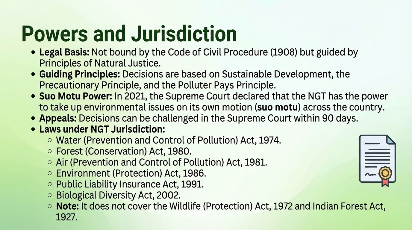The Supreme Court's 2021 judgment in Municipal Corporation of Greater Mumbai vs Ankita Sinha defined the NGT as a "specialized protector" of the environment with suo motu powers, meaning it can initiate cases on its own without a formal petition, rather than just acting as a passive adjudicator.