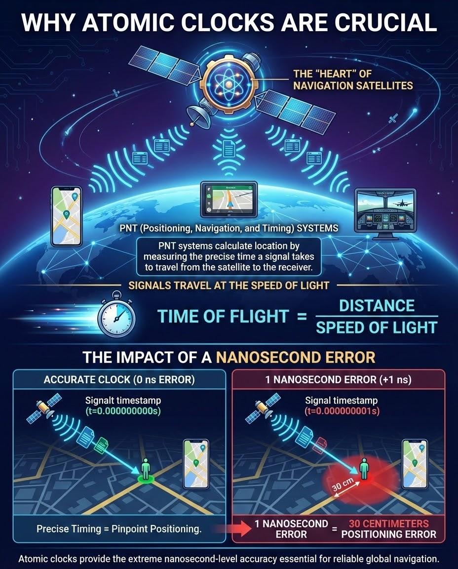 Navigation systems determine a user's location by calculating how long it takes for a signal to travel from the satellite to a receiver. Because these signals travel at the speed of light, a timekeeping error of just one nanosecond results in a 30-centimeter error in the user's location. Atomic clocks provide the extreme precision needed to prevent these errors.