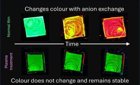Researchers at CeNS Bengaluru have stabilized CsPbX₃ perovskite nanocrystals using Ar-O₂ plasma treatment, which minimizes anion migration by cross-linking surface ligands and forming a hydrophobic barrier. This innovation significantly enhances color stability and environmental resilience, paving the way for durable, energy-efficient perovskite LEDs for next-generation optoelectronic devices, ensuring global impact.