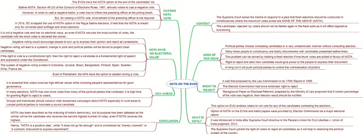 - Giving legal or constitutional status to NOTA and making it mandatory for parties to nominate fresh candidates if NOTA get more than 50% of the votes in a constituency.