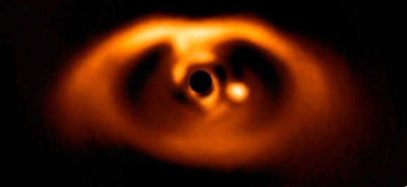The researchers used the ALMA observatory in Chile's Atacama desert to detect the disc of swirling material accumulating around one of two newborn planets seen orbiting a young star called PDS 70, located a relatively close 370 light years from Earth.