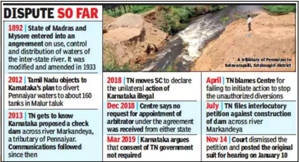 Tamil Nadu approached the Supreme Court in 2018 to oppose Karnataka’s construction of check dams and diversion structures on the Pennaiyar River. |