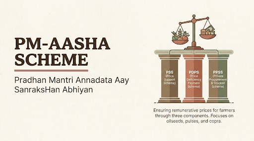 PM-AASHA (Pradhan Mantri Annadata Aay SanraksHan Abhiyan) is an umbrella scheme launched by the Government of India in 2018. It aims to provide remunerative prices to farmers for their produce, moving from mere "price declaration" to tangible "price assurance," with a focus on pulses, oilseeds, and copra.