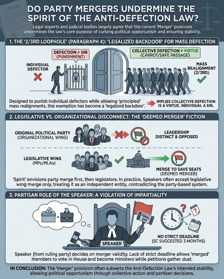 Legal Ambiguity: Although law mandates both organizational and legislative wings to merge, Speakers frequently allow "Deemed Mergers" involving only legislators, even against the parent party's opposition.