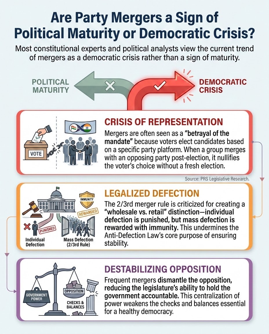 Beyond ideological alignment, the primary driver for modern political mergers in India is statutory immunity from the Anti-Defection Law.