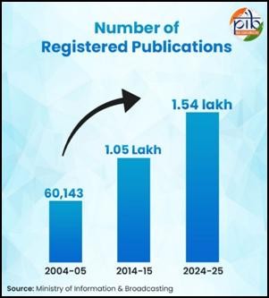 India’s media sector has expanded significantly, with registered publications rising from 60,143 in 2004–05 to 1.54 lakh in 2024–25.
