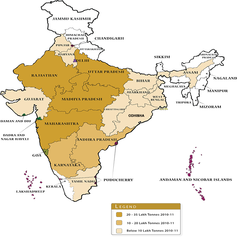 Madhya Pradesh, Maharashtra, Rajasthan, Uttar Pradesh and Karnataka are the top five pulses producing States.