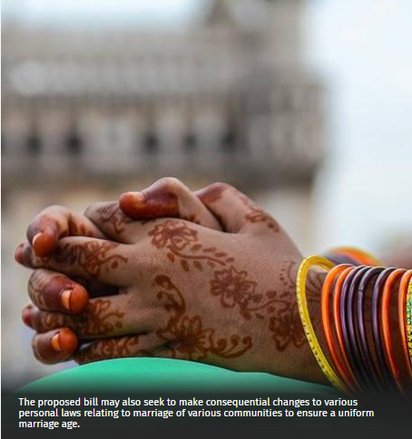The proposed Bill may also contain amendments to various personal laws relating to marriage of various communities to ensure a uniform age of marriage.