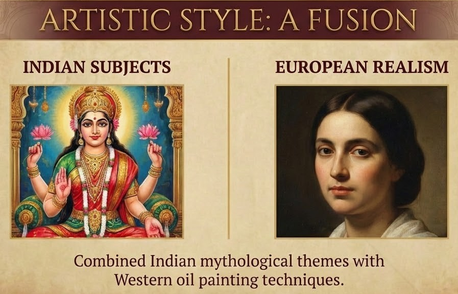 Subject Matter: While the technique was Western, the soul of his work was deeply Indian. He focused heavily on Hindu mythology (Puranas, Mahabharata, Ramayana) and portraits of Indian royalty.