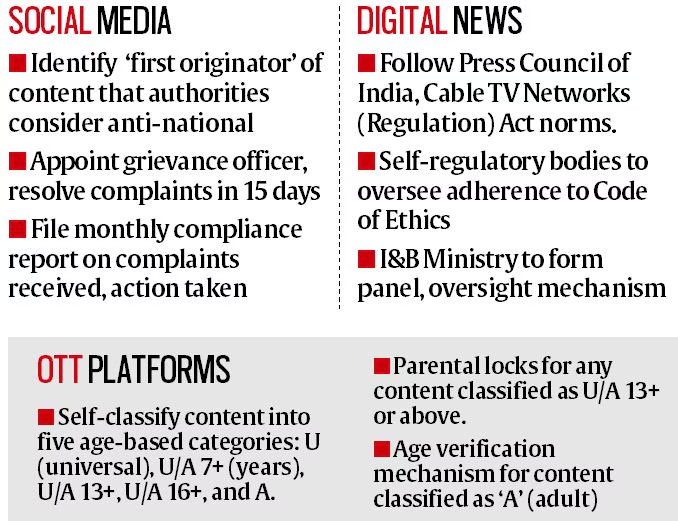- A big challenge is the lack of clear rules for regulating platforms like social media and OTT services. The IT Rules, 2021, have set up a 3-level process for complaints:
