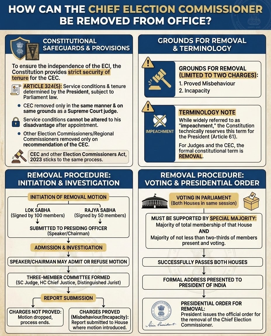As per Article 324(5) of the Constitution, the CEC can only be removed from office in the same manner and on the same grounds ("proved misbehaviour or incapacity") as a Judge of the Supreme Court. This involves an inquiry by a committee and subsequent passing of the removal motion by a special majority in both Houses of Parliament.