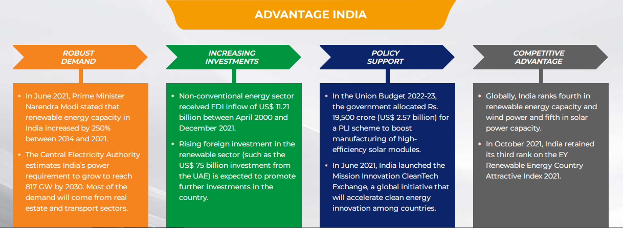 100% FDI is allowed in the renewable energy sector under the Automatic route and no prior Government approval is needed.