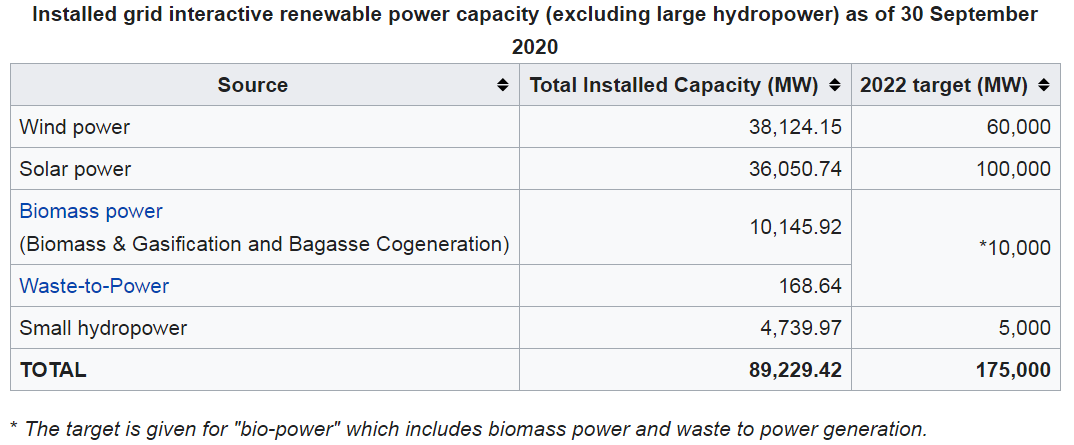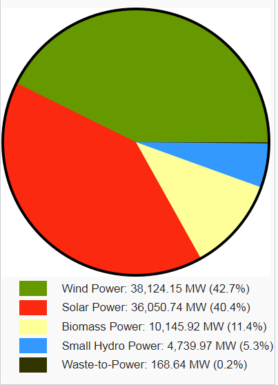 Fig: Installed grid interactive renewable power capacity in India as of 30 September 2020 (excluding large hydro)