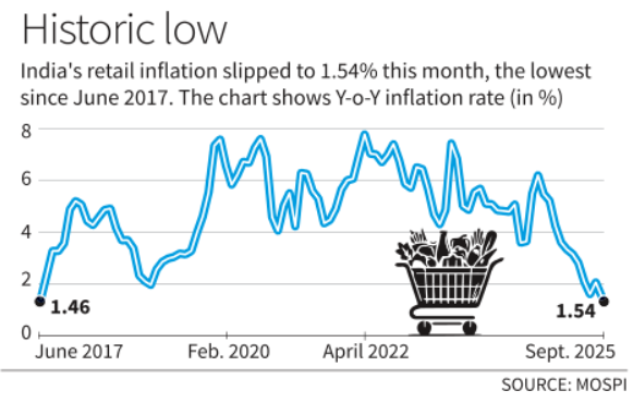 Retail inflation in India dropped to a 99-month low of 1.54% in September 2025, mainly due to a fall in food and fuel prices, according to data from the Ministry of Statistics and Programme Implementation.
