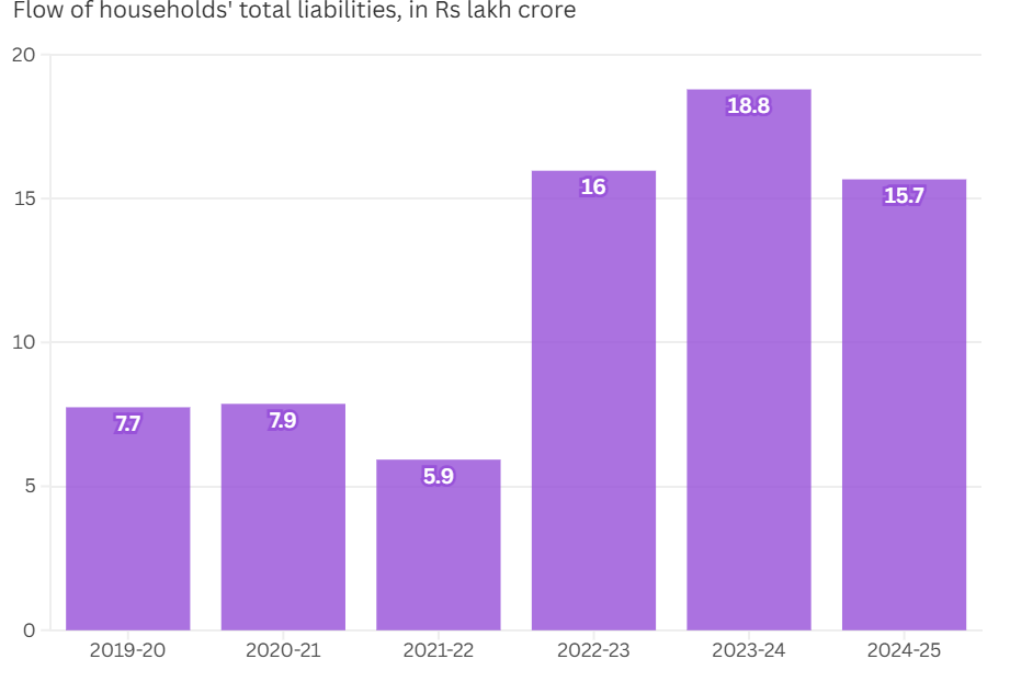 - Between 2019-20 and 2024-25, the annual financial assets added by households increased by 48%, from ₹24.1 lakh crore to ₹35.6 lakh crore.