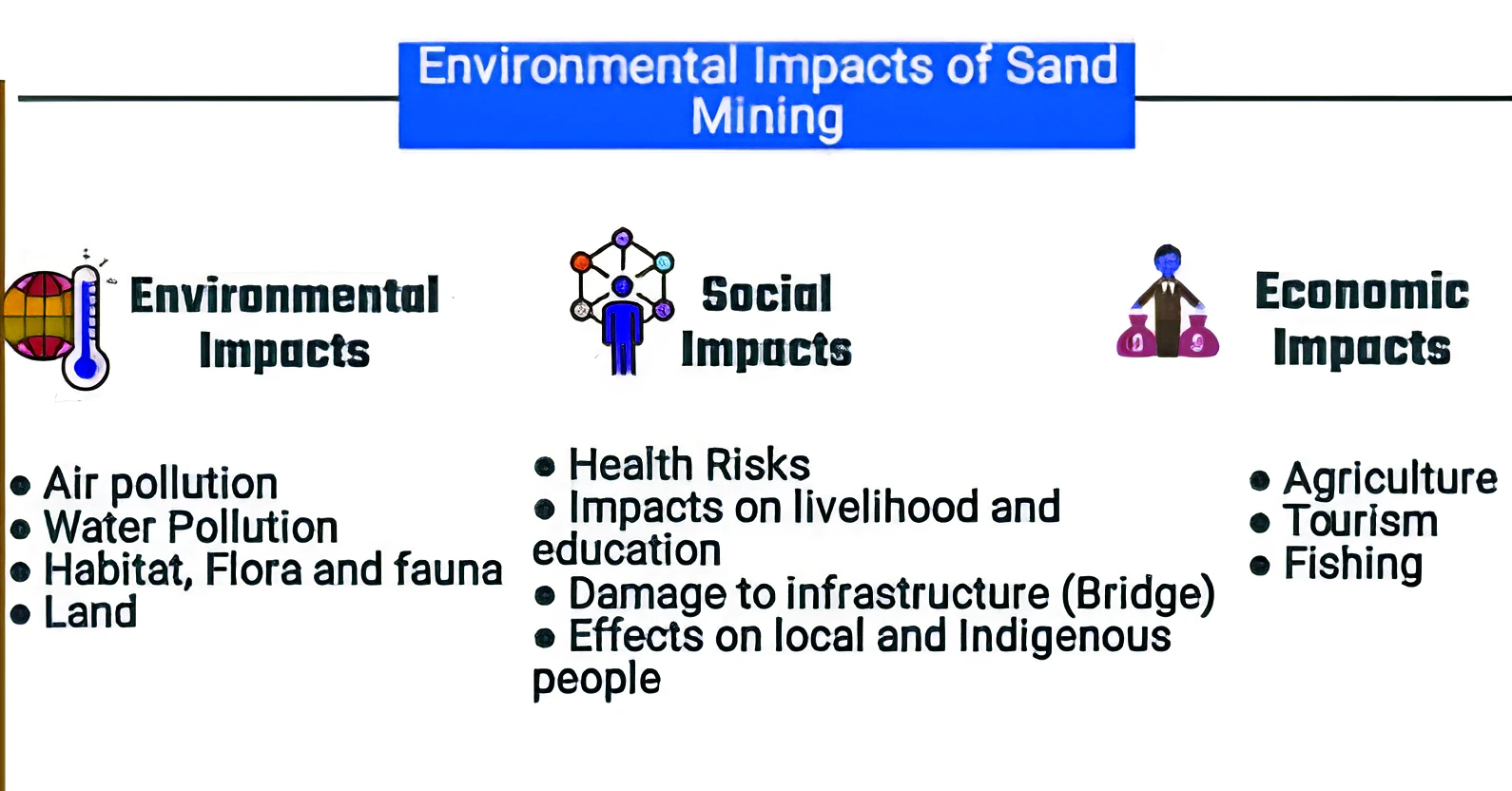 Groundwater Depletion: Sand beds are vital for filtering water and recharging aquifers. Their removal lowers the riverbed and inhibits the water-holding capacity, causing the groundwater table to drop.