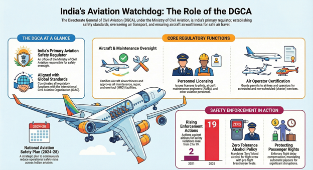 DGCA struggles to balance passenger safety with fast aviation growth, exposed by disruptions over new fatigue rules. While reforms like eGCA improved global safety rankings, staff shortages and limited autonomy persist. Converting DGCA into an autonomous Civil Aviation Authority is essential for managing India’s aviation boom safely.