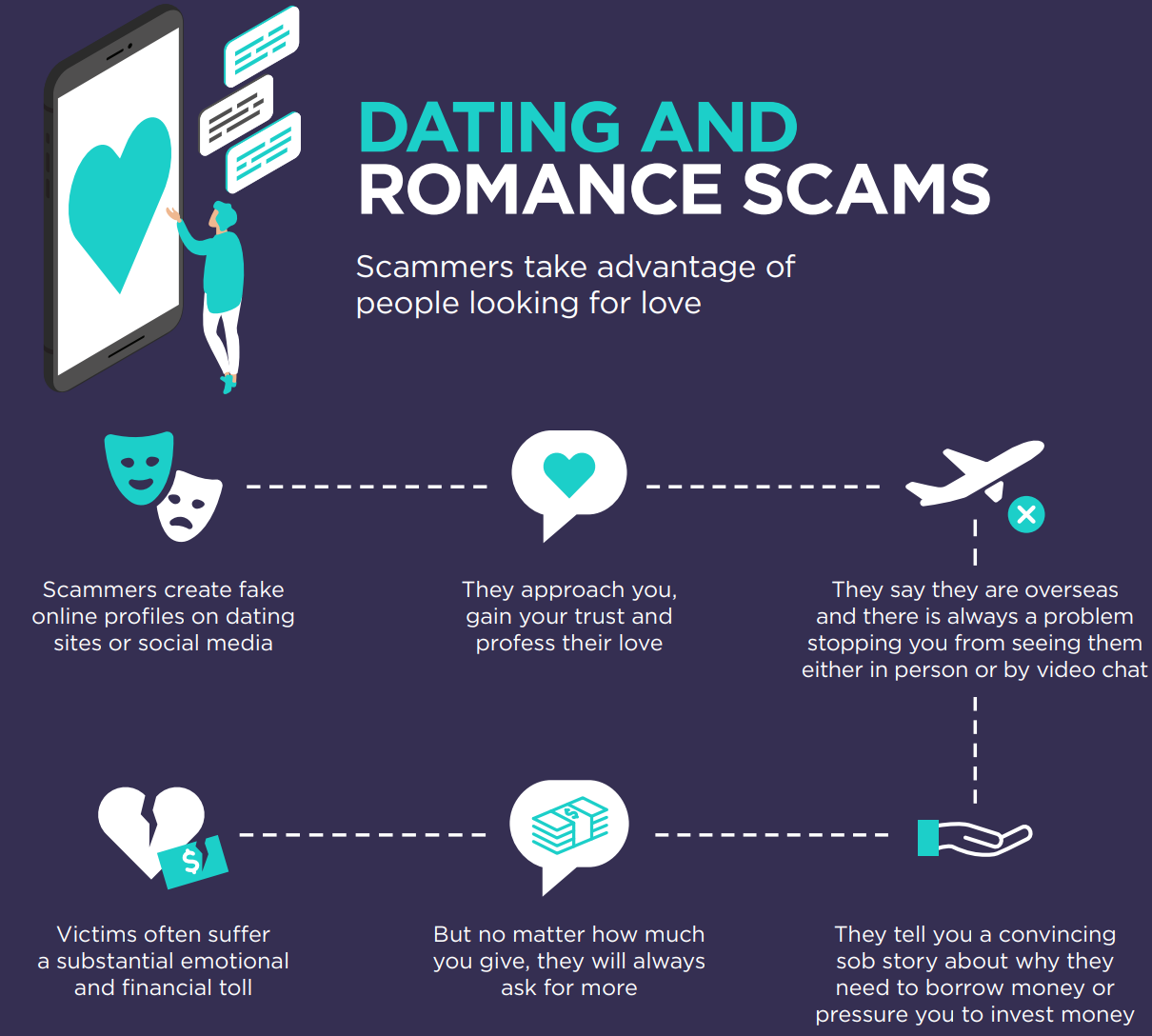 Romance scams happen when scammers create fake identities on dating apps or social media. After that they try to make emotional connections with people. Once they make connections and gain the victim's trust then they start asking for money, gifts, or personal details.