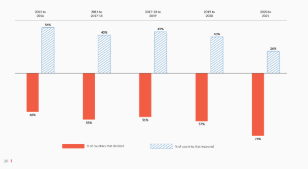 - This pre-pandemic negative trend seriously expanded during the COVID-19 pandemic, reaching a new high of 74% of all countries surveyed.