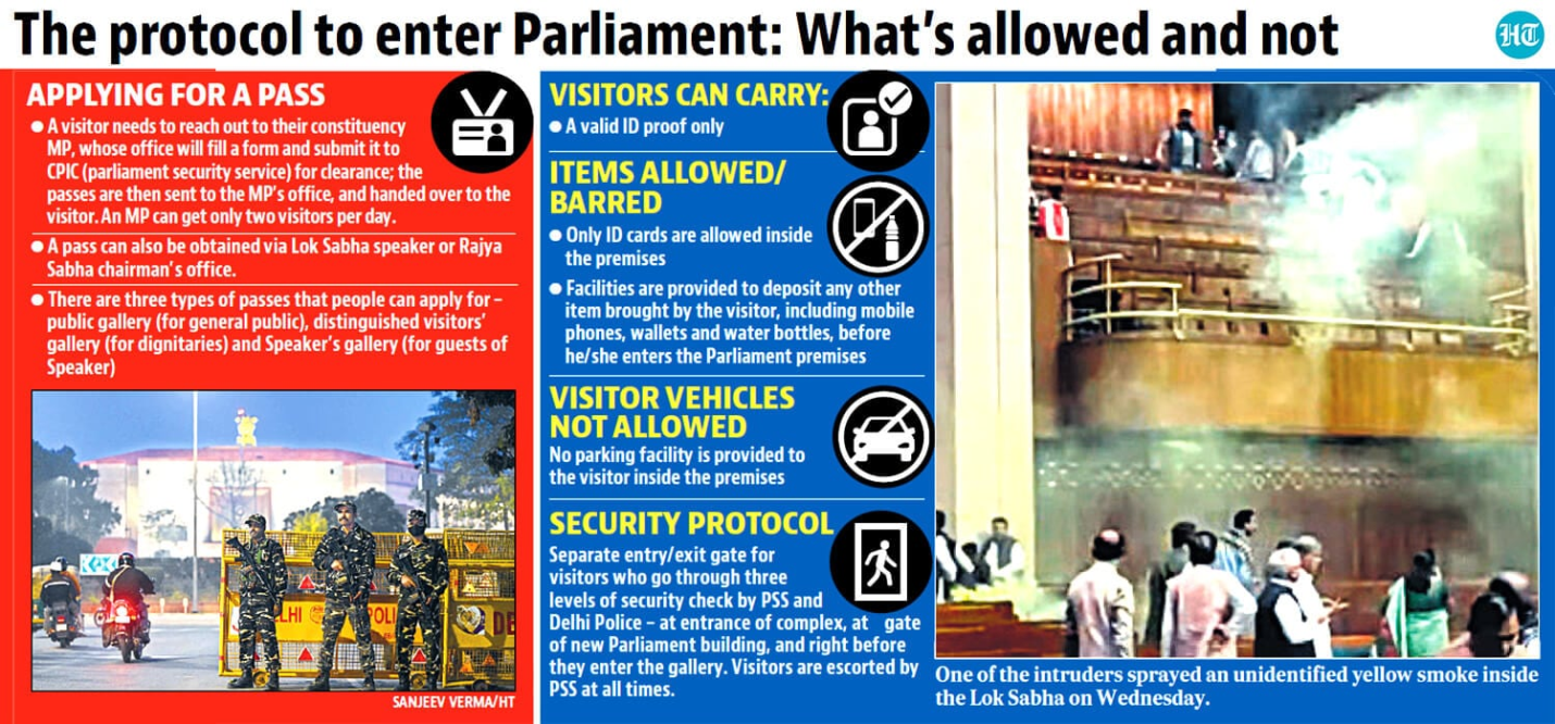 Context: Following a recent incident where a visitor breached the Lok Sabha chamber, visitor entry has been put on hold without any official statement. This indicates increased security worries and possible future changes in the screening process.