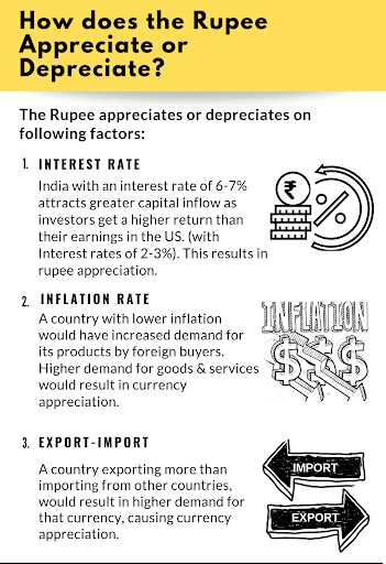 Rupee Depreciation refers to the fall in the value of the Indian Rupee (INR) against a floating foreign currency, specially the US Dollar (USD), due to market forces of demand and supply.