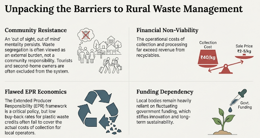 India’s rural waste crisis reflects rising consumption, weak infrastructure, and poor data. Evidence from Murud shows top-down fixes fail amid local complexity. Success, as in Korlai, needs strong local leadership and community ownership. Empowering Gram Panchayats, decentralised models, and reforming ineffective EPR financing are essential for sustainable solutions.