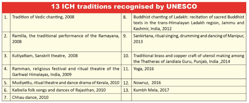 - Scheme for Safeguarding the Intangible Cultural Heritage, which aims to promote the 13 intangible cultural heritage of India, recognised by the United Nations Educational, Scientific and Cultural Organization (UNESCO).