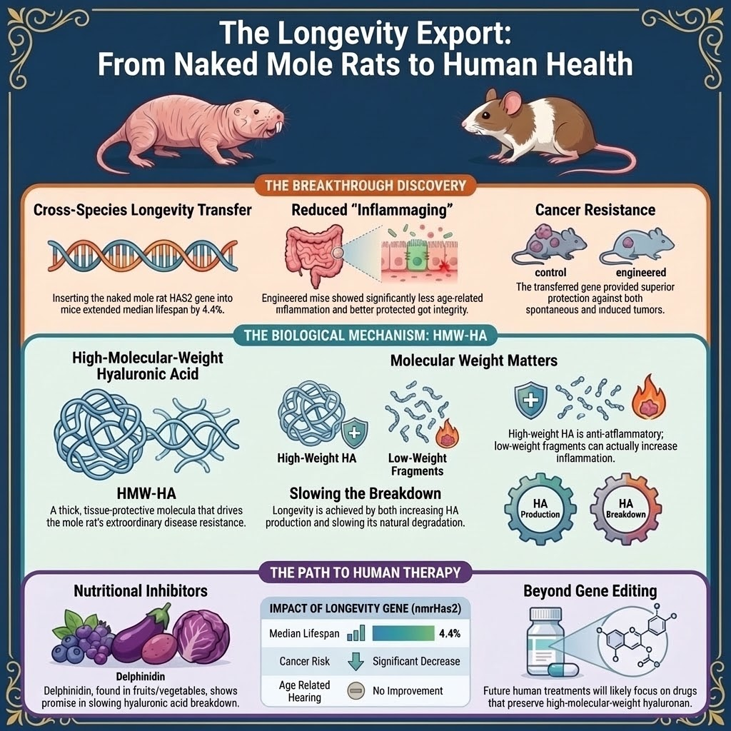 Researchers transferred the naked mole rat longevity gene HAS2 to mice, increasing high-molecular-weight hyaluronic acid that reduces cancer risk and inflammaging. The mice showed better healthspan and slightly longer lives. The discovery may enable human anti-aging therapies but raises ethical, safety, and equity concerns.