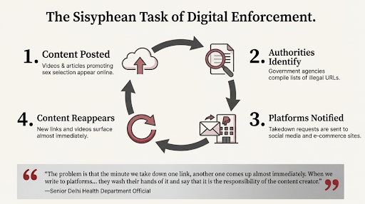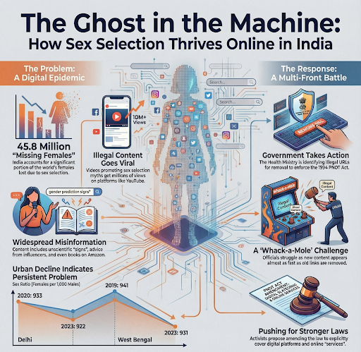 Despite the PC-PNDT Act, illegal sex determination has moved online, using encrypted apps, social media, and cross-border blood testing. This digital shift risks reversing SRB gains and sustaining son preference. Effective response needs cyber policing, intermediary accountability, global cooperation, and sustained social change nationwide campaigns.