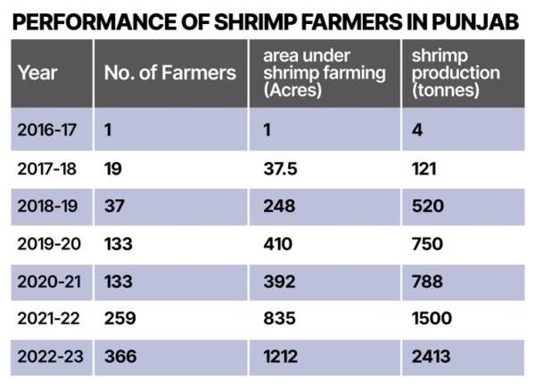 - As of 2022-23, a total of 1,212 acres of land in south-west Punjab is under shrimp farming, with a total production of 2,413 tonnes of shrimps.