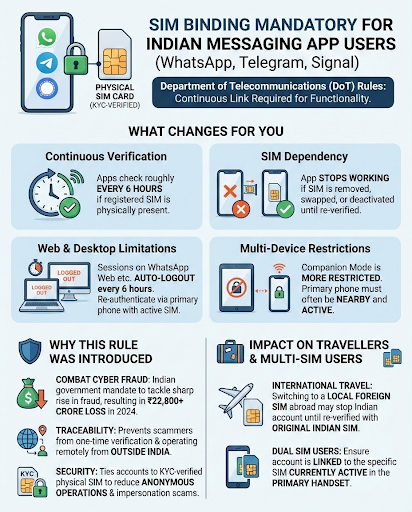 The Department of Telecommunications (DoT) has mandated SIM binding for Over-the-Top (OTT) messaging applications like WhatsApp, Telegram, and Signal, effective from March 1, 2026.