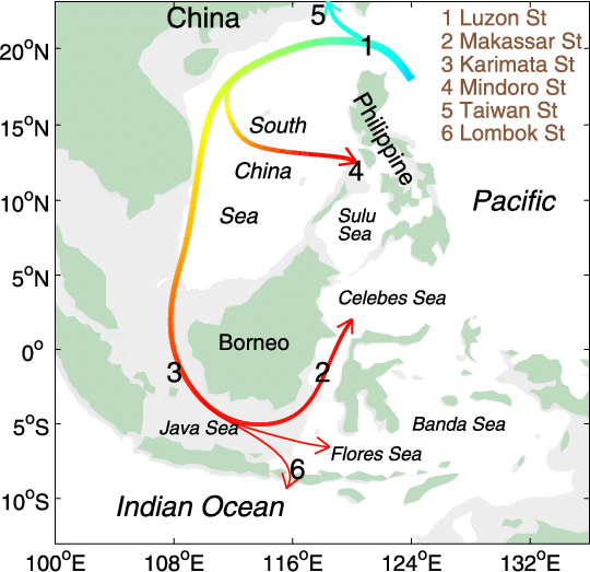 Straits nearby: It communicates with the East China Sea via the Taiwan Strait; the Philippine Sea via the Luzon Strait; the Sulu Sea via the straits around Palawan; the Strait of Malacca via the Strait of Singapore; and the Java Sea via the Karimata and Bangka Strait.