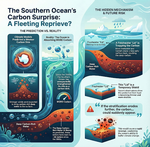 Recent research finds a “carbon anomaly” in the Southern Ocean, where CO2 absorption has strengthened since the 2000s. Antarctic meltwater creates a freshwater lid that traps carbon below. This temporary climate buffer exposes model flaws and risks a sudden reversal into a carbon source.