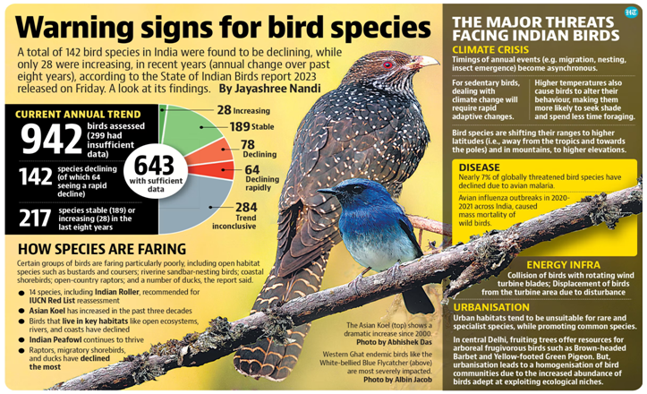 - The report indicates a widespread decline in the numbers of most bird species across India.